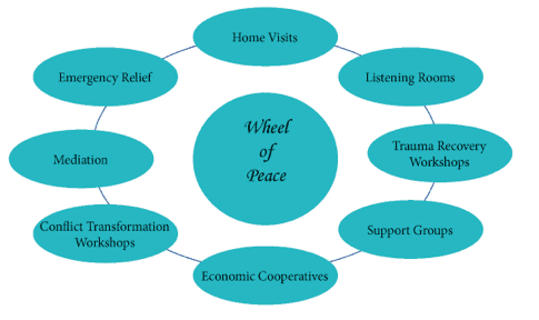The key to our success is an integrated, holistic approach that combines trauma healing, conflict transformation and economic self sufficiency as well as a suite of services delivered at our Center and also in the communities we serve. We call this multi-layered approach our Wheel of Peace, by which people enter our community through different services, but once they become involved, they have access to the total suite of services we provide.